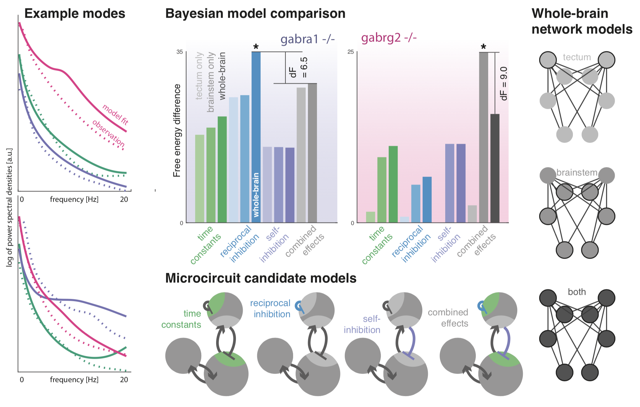 [Left] Networks of coupled neural masses are fitted to 1 minute worth of data recorded from 4 minutes after the light exposure (to capture steady state responses). These fitted models capture key differences between the phenotypes. [Right and Center Bottom] To assess whether the main deviations of the two mutant genotypes from wildtypes between conditions can be explained with subsets of parameters, we compared combinations of models across two model families - one (right) where parameters only vary in restricted parts of the anatomy; and one (bottom) where only some aspects of local inhibition are altered by the mutations. |